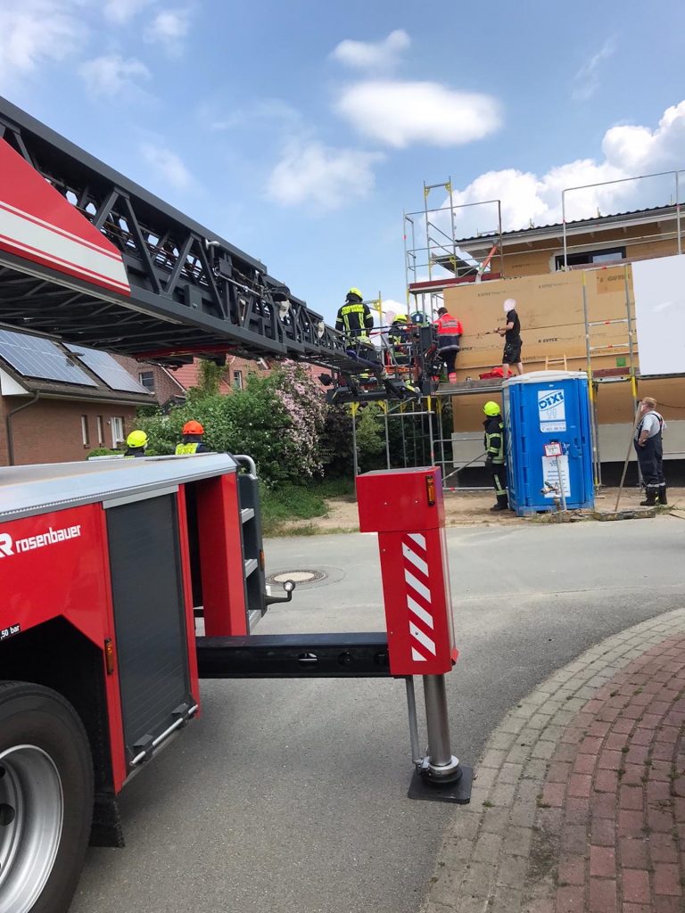 Ein Handwerker hatte sich bei Arbeiten verletzt und konnte das Gerüst nicht mehr aus eigener Kraft verlassen. Nach der Erkundung durch die ersten Einsatzkräfte wurde umgehend die Drehleitereinheit aus Damme alarmiert, um eine patientenschonende Rettung zu ermöglichen. Nach der Versorgung durch den Rettungsdienst wurde die verletzte Person zur weiteren Behandlung in ein Krankenhaus gebracht.