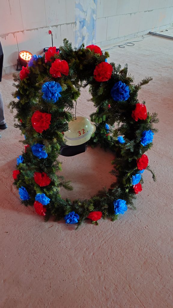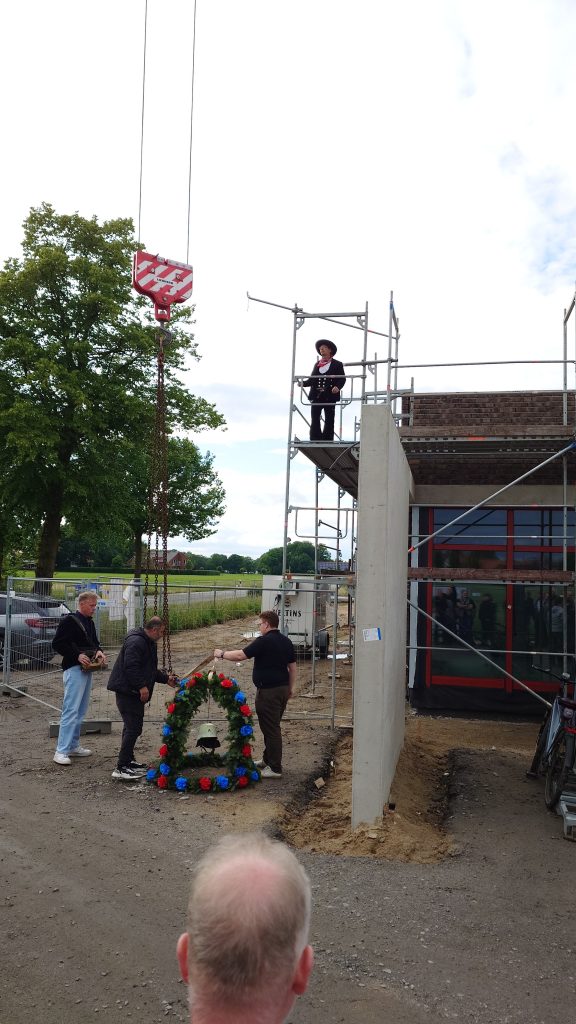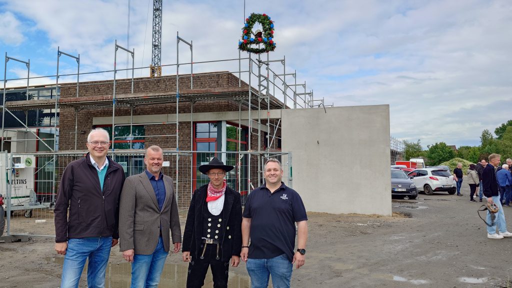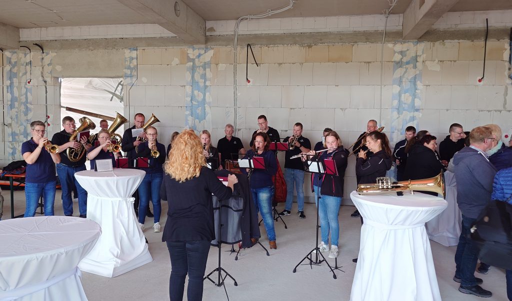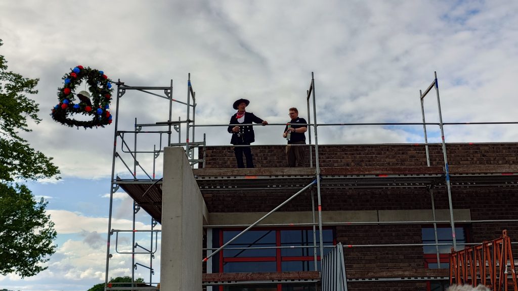 Anschließend ging es nach draußen, wo die Richtkrone aufgehangen wurde und der Richtspruch von dem Dachdeckermeister Alexander Haude vorgetragen wurde. Nach dem der Richtspruch abgeschlossen war, konnten die Gäste sich einen ersten Einblick von dem neuen Gebäude machen. Abgerundet wurde der Abend durch Musik der Feuerwehrkapelle, einen Imbiss sowie Kaltgetränke.